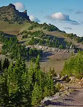 The Watchman Peak trail begins from the Watchman Overlook parking lot, about 3.8 mi (6.1 km) northwest of Rim Village.[21] The trail is 0.8 mi (1.3 km) long with a 420-foot (130 m) elevation change.[22] It is a steady uphill trail on an isolated mountain on the west rim of the crater, with several switchbacks, providing wide views of Crater Lake and Wizard Island. Several nearby landmarks are visible from the summit, including Mount McLoughlin, Mount Thielsen, Union Peak, Mount Scott and the Klamath Basin. The trail ends next to a historic fire lookout tower built in 1932.[21]