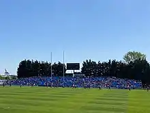The East Stand is a covered terrace that runs almost the full length of the pitch. The right side was extended in 2008,[7] and the left side is planned for future expansion; this extension was placed on hold in 2011 due to the development of the North Stand,[8][9] however the club announced in December 2023 that reviving the plan was being considered as a result of high demand for tickets pushing Craven Park towards full capacity, with the aim being to provide a short-term capacity increase ahead of the redevelopment of the West Stand.[28]