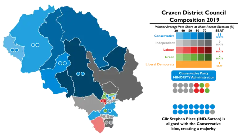 Craven District Council in North Yorkshire, England was established in 1974 and abolished in 2023. One third of councillors were elected each year, followed by one year when there was an election to North Yorkshire County Council instead. Since the last boundary changes in 2002, 30 councillors had been elected from 19 wards.[1]