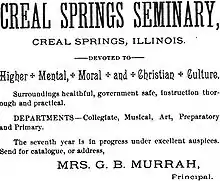 The Creal Springs Seminary, later known as the Creal Springs College and Conservatory of Music, was an educational institution in Creal Springs, Illinois, USA from 1884 to 1916. It was headed by Principal Gertrude Brown Murrah, a graduate of the Mount Carroll Seminary in Mount Carroll, Illinois. The school was built as a three-story frame building on a five-acre site on the north edge of town, on land acquired from the Creal family by Mrs. Murrah and her husband Henry Clay Murrah. It opened on September 22, 1884, and was chartered in August 1888 by the State of Illinois as Creal Springs Seminary Company.[1]