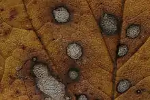 The fungus develops on the surface of the leaf blades. At first there are scattered water-soaked grey spots about 1 mm (0.04 in) in diameter, but as the disease progresses, these lesions expand and coalesce and much of the leaf surface may be affected. Fruiting bodies resembling tiny white pinheads develop on either the upper or lower side (or both) of the leaf, particularly near the veins. Small black sclerotia may also form. At some stage the leaves wilt and eventually fall prematurely.[2] In the Polish study, many of the affected host trees had characteristic pigmentation of the necrotic areas, with the centre and periphery of the lesions differing.[4]