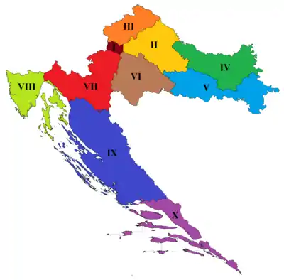 The first ten districts are roughly based on geography, but shaped according to the number of voters so that each district holds roughly the same amount of registered voters, around 400,000.[2] These districts therefore do not correspond to the borders of top administrative divisions within Croatia and each district contains one or more or parts of several Croatian counties.