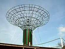 - A metal lattice funnel (or "extended conical section") radiating above and outward from and connected to the top of the cylinder.