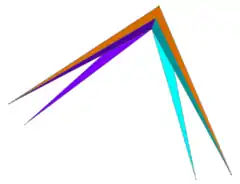 ![]() There are two choices on the orientation of the other crossed square cupola. One aligns corresponding faces (triangles with triangles, squares with squares) and produces the nonconvex great rhombicuboctahedron. This construction has D4h symmetry, although the nonconvex great rhombicuboctahedron has full octahedral symmetry. |