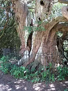 Like the village of the same name in Surrey, this East Sussex Crowhurst also has an ancient yew tree (Taxus baccata) in the grounds of its church which is also dedicated to St George. This has caused much confusion. The Sussex yew is cordoned off by iron railings and reinforced with steel wires to prevent collapse. The tree's age is uncertain but estimates range from 1,300 to 4000 years. [15]