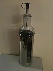 A cruet (/ˈkruːɪt/), also called a caster,[1] is a small flat-bottomed vessel with a narrow neck. Cruets often have a lip or spout and may also have a handle. Unlike a small carafe, a cruet has a stopper or lid. Cruets are normally made of glass, ceramic, stainless steel or copper.