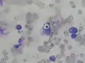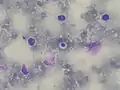 Micrograph of cryptococcosis showing the characteristically thick capsule of cryptococcus. Field stain.