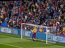 In November 2012, Ian Holloway became the new Palace manager.[54] He guided the club back to the Premier League after an eight-year absence by defeating Watford 1–0 in the Championship play-off final at the new Wembley, but resigned in October 2013.[55] Following a brief spell under Tony Pulis,[56] and an unsuccessful second tenure for Neil Warnock, former Palace player Alan Pardew was confirmed as the new manager in January 2015.[57] In his first full season, Pardew led the club to the 2016 FA Cup final, their first for 26 years. Palace met Manchester United who they had lost to in the 1990 final, and the Eagles suffered disappointment again losing 1–2 after extra-time. In December 2016, Pardew was sacked and replaced by Sam Allardyce, who kept the club in the Premier League, but resigned unexpectedly at the end of the season.[58] On 26 June 2017, Palace appointed Frank de Boer as their first ever permanent foreign manager.[59] He was dismissed after only 77 days in charge, with the club having lost their first four league games at the start of the 2017–18 season while failing to score in any of them.[60] Former England manager Roy Hodgson was appointed as the club's new manager the next day.[61] Palace finished in eleventh-place in the Premier League in Hodgson's first season, twelfth in the 2018–19 season and fourteenth the following season.