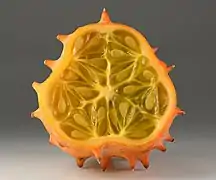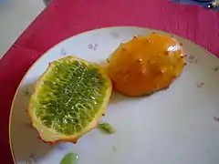Cucumis metuliferus, commonly called the African horned cucumber, horned melon, spiked melon, jelly melon, or kiwano, is an annual vine in the cucumber and melon family Cucurbitaceae. Its fruit has horn-like spines, hence the name "horned melon". The ripe fruit has orange skin and lime-green, jelly-like flesh. C. metuliferus is native to Southern Africa,[1][2] in South Africa, Namibia, Botswana, Zambia, Zimbabwe, Mozambique, and Angola.