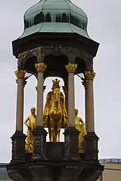 - The Magdeburg Rider, most likely a portrayal of Otto I (together with two maiden flanking him), erected in 1240 and now in the Kulturhistorischen Museum Magdeburg (a famous copy stands at the Alten Markt) is Germany's oldest equestrian statue.[63] As the founder of the city and the diocese, Otto has always had an important role in the city's culture of remembrance. Since 2010, the city has been called the Ottostadt (Otto's city)[64][65] The Magdeburg Rider influenced Maximilian I's plan for his own equestrian monument.[66]