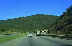 The Cumberland Gap Tunnel is a dual-bore, four lane vehicular tunnel that carries U.S. Route 25E under Cumberland Gap National Historical Park near the intersection of Kentucky, Tennessee, and Virginia. The tunnel consists of two separate bores which carry four lanes of traffic between Cumberland Gap, Tennessee and Middlesboro, Kentucky. It is one of only two mountain vehicular tunnels in the United States that cross a state line, the other being the East River Mountain Tunnel on Interstate 77 and U.S. Route 52 between Virginia and West Virginia. The tunnel opened to traffic in 1996 and replaced a section of highway through the Cumberland Gap that had earned the nickname "Massacre Mountain" due to its hazardous design and high rate of traffic accidents.