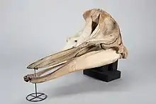 The species was named Ziphius cavirostris by Georges Cuvier, based on a skull fragment which he believed to be a fossil from an extinct species.[11] He reused the genus name Ziphius from an undetermined species mentioned by historical sources.[12] The species name cavirostris, from Latin cavus "hollow" and rostrum "beak", refers to a bony structure (cavity) anterior of the nares (the bones of the nose), now known as the prenarial basin. It is now known to be unique to males of this species.[13][11]