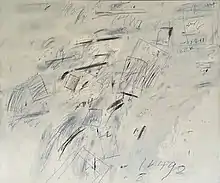 After his return in 1953, Twombly served in the United States Army as a cryptologist, an activity that left a distinct mark on his artistic style.[16] From 1955 to 1959, he worked in New York, where he became a prominent figure among a group of artists including Robert Rauschenberg, with whom he was sharing a studio,[17] and Jasper Johns. Exposure to the emerging New York School purged figurative aspects from his work, encouraging a simplified form of abstraction. He became fascinated with tribal art, using the painterly language of the early 1950s to invoke primitivism, reversing the normal evolution of the New York School. Twombly soon developed a technique of gestural drawing characterized by thin white lines on a dark canvas that appear to be scratched onto the surface. He would apply bitumen on the canvas in a quick and coarse fashion, making the painting tactile and scarred with his energetic, gestural lines that would become his signature style.[18][19] He stopped making sculptures in 1959 and did not take up sculpting again until 1976.[20]