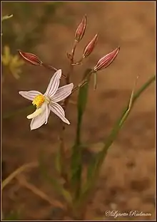 Cyanella lutea (commonly known as "Five-fingers" or "Geelraaptol") is a species of cormous herb, native to South Africa (Cape Provinces and Free State) and southern Namibia, where it grows in clay-rich or loamy soils.