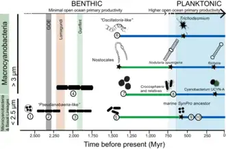 Cyanobacteria are globally widespread photosynthetic prokaryotes and are major contributors to global biogeochemical cycles.[25] They are the only oxygenic photosynthetic prokaryotes, and prosper in diverse and extreme habitats.[26] They are among the oldest organisms on Earth with fossil records dating back at least 2.1 billion years.[27] Since then, cyanobacteria have been essential players in the Earth's ecosystems. Planktonic cyanobacteria are a fundamental component of marine food webs and are major contributors to global carbon and nitrogen fluxes.[28][29] Some cyanobacteria form harmful algal blooms causing the disruption of aquatic ecosystem services and intoxication of wildlife and humans by the production of powerful toxins (cyanotoxins) such as microcystins, saxitoxin, and cylindrospermopsin.[30][31] Nowadays, cyanobacterial blooms pose a serious threat to aquatic environments and public health, and are increasing in frequency and magnitude globally.[32][25]