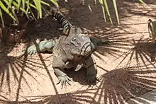Cyclura cychlura figginsi, known by the common name of guana[4] and sometimes called the Exuma Island iguana in the international literature, is a subspecies of the northern rock iguana, C. cychlura, that is found on the Exuma island chain in the Bahamas with an estimated wild population of 1,300 animals in 2004, it has been listed on the IUCN Red List as critically endangered.[1]