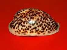 ![]() A shell of Cypraea pantherina from Sudan, lateral view, anterior end towards the right |