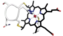 - 1 2 Kranz RG, Richard-Fogal C, Taylor JS, Frawley ER (September 2009). "Cytochrome c biogenesis: mechanisms for covalent modifications and trafficking of heme and for heme-iron redox control". Microbiology and Molecular Biology Reviews. 73 (3): 510–28, Table of Contents. doi:10.1128/MMBR.00001-09. PMC 2738134. PMID 19721088.