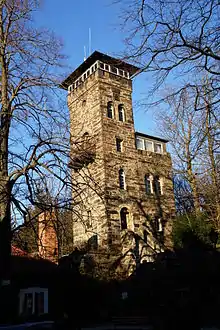On the mountain there is a 23 m high observation tower[15] from the 19th century and a restaurant with a beer garden. The construction was applied for in 1850 by the forester Walde from Wuischke to the city council of Bautzen. First, the tower was built by Karl Traugott Eichler from Lauba according to the design of the architect Traugott Hobjan from Bautzen. This was completed on May 17, 1851 and opened in 1852 together with the inn. In 1856 a well was completed. The stone tower is the oldest of its kind in Upper Lusatia. In 1928 the tower was given a wooden structure, which burned down on December 19, 1944. Due to its proximity to Bautzen and the good infrastructure on the mountain, the summit of the Czorneboh is a popular destination.[16]