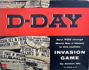 D-Day was designed by Avalon Hill's founder, Charles S. Roberts. Published in 1961, it was the first wargame that featured both a hex grid map and cardboard counters.[4] Due to some issues with the rules, a second edition (known as 1961b) was published almost immediately.[5] In 1965, Larry Pinsky revised the game again. Another revision by James Stahler appeared in 1977. All of these revisions used the same map and counter mix as the original game.