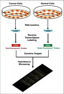 A DNA microarray (also commonly known as DNA chip or biochip) is a collection of microscopic DNA spots attached to a solid surface. Scientists use DNA microarrays to measure the expression levels of large numbers of genes simultaneously or to genotype multiple regions of a genome. Each DNA spot contains picomoles (10−12 moles) of a specific DNA sequence, known as probes (or reporters or oligos). These can be a short section of a gene or other DNA element that are used to hybridize a cDNA or cRNA (also called anti-sense RNA) sample (called target) under high-stringency conditions. Probe-target hybridization is usually detected and quantified by detection of fluorophore-, silver-, or chemiluminescence-labeled targets to determine relative abundance of nucleic acid sequences in the target. The original nucleic acid arrays were macro arrays approximately 9 cm × 12 cm and the first computerized image based analysis was published in 1981.[1] It was invented by Patrick O. Brown. An example of its application is in SNPs arrays for polymorphisms in cardiovascular diseases, cancer, pathogens and GWAS analysis. It is also used for the identification of structural variations and the measurement of gene expression.