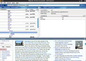 A DOM node can be selected from the tree structure, or by clicking on the browser chrome. As well as the DOM tree viewer, other viewers are also available, including Box Model, XBL Bindings, CSS Rules, Style Sheets, Computed Style, JavaScript Object, as well as a number of viewers for document and application accessibility. By default, the DOM Inspector highlights a newly selected non-attribute node with a red flashing border.