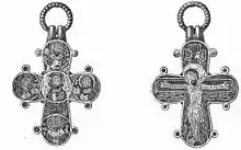The cross is made from gold and enamel, and measures approximately 4.3 by 2.9 by 0–3 centimetres (1.7 in × 1.1 in × 0.0 in–1.2 in). One side of the cross depicts Christ on the cross, Basil of Caesarea and John Chrysostom.[2]