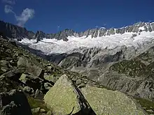 The Damma Glacier (German: Dammagletscher) is a small glacier situated in the central Swiss Alps.[1][2] It has been in retreat since around 1850.[3] The area between the front of the retreating glacier and the moraine from the most recent glacier recession – called the glacial forefield[4] – measures 10.7 square kilometres (4.1 sq mi) and is composed of granitic rocks.[3][1]