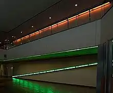 Flavin realized his first full installation piece, greens crossing greens (to Piet Mondrian who lacked green), for an exhibition at the Van Abbemuseum, Eindhoven, Netherlands, in 1966.[19] In 1968 the Heiner Friedrich Gallery in Munich exhibited the light installation "Two primary series and one secondary", presented in three exhibition rooms, which Flavin developed especially for the gallery. The collector Karl Ströher purchased the installation in the same year. Peter Iden, founding director of the Museum für Moderne Kunst Frankfurt acquired the installation together with 86 other works from the former Ströher Collection for the Frankfurt Museum. After a first presentation in 1989,[20][21] it was shown in various exhibitions at the museum between 1999 and 2002.[22] Flavin himself examined the installation in Frankfurt in February 1993 and then adapted his installation concept for the museum.[23]