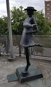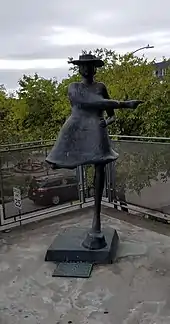 Other sources describe a 1971 full-length abstract bronze statue, also known as Girl with Flat Hat and Pointing Dancing Woman,[2] installed at the 15th Avenue pedestrian bridge by Schmitz Hall on the University of Washington campus in Seattle, Washington's University District. According to the Smithsonian Institution, which surveyed the work and deemed it "treatment needed" as part of its "Save Outdoor Sculpture!" program in June 1994, the sculpture was donated to the University in 1971 by the William G. Reed family in honor of Eleanor Henry Reed. It depicts a female wearing a flat hat and skirt; she stands on her proper left tiptoe and her opposite leg is lifted and bent behind her. She points westward with her proper right arm. The sculpture measures 6.5 feet (2.0 m) tall and 18 inches (0.46 m) wide and rests on a bronze base that measures approximately 5 inches (0.13 m) x 2 feet (0.61 m) x 2 feet (0.61 m).[2] In 1989, when Levine discovered that the leg was broken as the result of vandalism, he asked to repair the piece at his home.[3] It is administered by the University of Washington's Public Art Administration.[2]