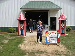 - The Danebod Gym Hall was erected in 1904 and is a cruciform clapboard building. The two sides of the entrance arm project forward to the eaves, and the sides plus a small roof enclose the entrance.[4] It was originally built as a space for Danish gymnastics, folk dancing, music, theatrical performances, larger social gatherings, and worship for the Folk School students and other locals. Every year in the Gym Hall, the Danebod Lutheran Church upholds the Danish tradition of dancing around the Christmas tree. The basement is also commonly used for crafts such as stained glass and woodworking.[38] In 1928 it was enlarged with a stage, basement and furnace. Many home talent plays were presented there, and it is still used for an occasional play, and is also used by the camps and retreats for folk dancing. Points of interest are the statue with an original canvas curtain with advertising, bars used years ago by gymnasts (on the south wall), and the original wainscoting on the walls.[37]