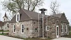 - The Danebod Stone Hall was built in 1889 and is a single-floor stone building in the form of a Latin cross. Its entrance wing features medieval-inspired crenellations, but the rest of the building with its pedimented windows are closer to being Greek Revival.[4] It was built from native field rock hauled in by farmers and split and shaped by a Danish stonemason named Kristian Klink. The Stone Hall was used as the first church, later as a gymnasium and assembly hall. Points of interest are the outdoor old bell from the former children's school, fresco from the Gym Hall, the old chandelier from the Cross Church, old photographs, and handcut field stone in the structure.[24] The Stone Hall is now a museum housing a collection of photographs, publications and objects important in Danebod history. It is also a venue for activities, lectures and discussion groups, and is typically open for public viewing during the Danebod Family Camp sessions.[38]