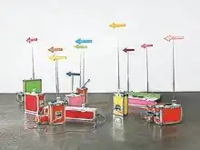 Jolliffe's 2014-15 kinetic installation, Nearest Costco, Monument or Satellite, deployed networked technology to humourously explore a contemporary sense of place. The work involved a grouping of sculptures built in fourteen road cases each of which was outfitted with a telescoping mast with a pointing arrow at its terminus.[10] Using locative technologies, when interacted with, these units point to the nearest orbiting GPS satellite, Costco store and local monument. Jolliffe described the work as a "kind of elaborate joke, but it's a serious one." The work was exhibited in Montreal, ISEA Vancouver, at the Museum of Nantes in France.[6] The work is a type of machine performance, that produces "choreographed poetic movement" of an array of arrows to convey both information and materiality.[11]