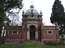 The small cemetery that accompanies the Mönchow church is the final resting place of the Dannenfeldt family. Carl Dannenfeldt commissioned a master mason from Swinemünde named Pistorius to build a mausoleum in the churchyard.[1] The mausoleum, which was completed in 1891, cost the Dannenfeldts 25,000 gold Marks.[2] The mausoleum houses three rooms with the walls made out of stucco. The outside walls are made out of red brick and the overall design is a Baroque style. There are cherubs that decorate the outside, with "Dannenfeldt" inscribed onto them.[3][4][5]