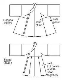 The Ming dynasty daopao is a full-length. It has a large frontal outer placket and smaller frontal inner placket. There is a pair of ties at the small placket and two pairs of ties on the large placket which is used for closing the garment.[4] The sleeves are large but are narrower around the wrists.[4] It characterized by a cross collar, which closes at the right side in the front, in a style called jiaoling youren.[4]