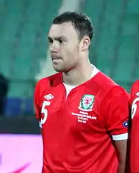 In May 2008, he received his first call-up, alongside six other uncapped members of the Wales under-21 side, to the Wales team.[45] Blake made his full international debut on 12 October 2010, being named in the starting line-up for a 4–1 defeat to Switzerland in Basel before being replaced by Christian Ribeiro after 54 minutes.[46] He played his second game against Scotland, in the Nations Cup, where Wales lost 3–1. On 10 August 2011, Blake scored his first senior career goal in a 2–1 defeat against Australia and was named in the starting line-up in the side's following match against Montenegro due to James Collins being suspended. Despite being largely a reserve player for Cardiff at the time, he established himself in the side as a centre back under manager Gary Speed, who described Blake as a player that could "shine in the Premier League,"[30] and kept his place in the side for the remainder of the Euro 2012 qualifiers,[47] including a 1–0 defeat against England where he received praise for his performance.[22][6]