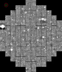 The DES began by developing and building Dark Energy Camera (DECam), an instrument designed specifically for the survey.[5] This camera has a wide field of view and high sensitivity, particularly in the red part of the visible spectrum and in the near infrared.[6] Observations were performed with DECam mounted on the 4-meter Víctor M. Blanco Telescope, located at the Cerro Tololo Inter-American Observatory (CTIO) in Chile.[6] Observing sessions ran from 2013 to 2019; as of 2021 the DES collaboration has published results from the first three years of the survey.[7]