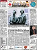 Das Echo began as the Das Echo des Deutschen Hauses für die deutsch-kanadische Gemeinschaft, founded by Paul Christian Walter in 1978. It first began printing as a quarterly newssheet for the German community in Greater Montreal.[3] Like the majority of newspapers in Germany, it is a subscriber's publication with a comparably small number of freely sold issues. Das Echo and the Deutsche Rundschau are the only newspapers by an ethnic minority (German) in Canada to have stringers in most Canadian provinces and many European countries.[4]