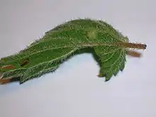 The nettle pouch gall develops in leaf veins, leaf petioles, flower stalks and sometimes the stem of Urtica dioica and Urtica urens. This structure is caused by the gall midge or gnat Dasineura urticae,[1] also spelled Dasyneura urticae.[2] Synonyms are Perrisia urticae and Cecidomyia urticae.[3]
