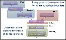 Hadoop is an open source software project sponsored by The Apache Software Foundation (http://www.apache.org) which implements the MapReduce architecture. The Hadoop execution environment supports additional distributed data processing capabilities which are designed to run using the Hadoop MapReduce architecture. These include Pig – a high-level data-flow programming language and execution framework for data-intensive computing. Pig was developed at Yahoo! to provide a specific data-centric language notation for data analysis applications and to improve programmer productivity and reduce development cycles when using the Hadoop MapReduce environment. Pig programs are automatically translated into sequences of MapReduce programs if needed in the execution environment. Pig provides capabilities in the language for loading, storing, filtering, grouping, de-duplication, ordering, sorting, aggregation, and joining operations on the data.[13] Figure 1 shows a sample Pig program and Figure 2 shows how this is translated into a series of MapReduce operations.