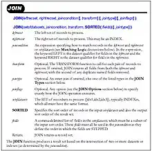 ECL includes built-in data transform operations which process through entire datasets including PROJECT, ITERATE, ROLLUP, JOIN, COMBINE, FETCH, NORMALIZE, DENORMALIZE, and PROCESS. For example, the transform function defined for a JOIN operation receives two records, one from each dataset being joined, and can perform any operations on the fields in the pair of records, and returns an output record which can be completely different from either of the input records. Example syntax for the JOIN operation from the ECL Language Reference Manual is shown in Figure 3. Figure 4 shows an example of the equivalent ECL code for the Pig example program shown in Figure 1.