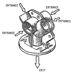 In 1984, Gunness filed a patent for a better way to use a manifold to combine the outputs of multiple compression drivers for increased sound power level (SPL), using two to four flat reflecting surfaces in the throat of a horn to redirect sound waves for a more coherent summation.[4] This low-distortion manifold design made it possible for EV to produce its first high-power concert and touring loudspeaker: the MT-4, with "MT" standing for "Manifold Technology". This was a 4-way system split between two enclosures, with four speaker drivers summed in each bandpass; a total of 16 drivers. The upper two bandpasses used the Gunness manifold design for compression drivers, each manifold formed of two zinc castings. The medium low frequencies were carried by four 10-inch (250 mm) cone drivers summed using a larger embodiment of the Gunness manifold concept based on ray tracing and reflection.[5] The MT-4 was a very heavy system at 633 pounds (287 kg),[6] but it put more power into a smaller package, and it was quicker to position and connect.[7] The MT-4 proved popular, used on major tours and festivals such as the 1995 Monsters of Rock at Donington Park in central England[8] and the main stage of the 1996 Lollapalooza tour featuring Metallica and Soundgarden.[9] Together, EV engineer David Carlson and Gunness presented a paper to the Audio Engineering Society (AES) in November 1986, describing the methods they used to sum four drivers in each bandpass.[5]