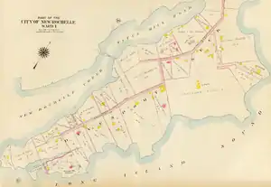 The influx of Huguenot refugees to New York City, following the revocation of the Edict of Nantes, soon made it clear that the projected settlement must be expanded to accommodate many other Huguenots and requiring much more land than was available on the narrow limits of the neck, so a contract to purchase six thousand acres, including the neck, and the balance on the mainland was entered into on July 2, 1687. The several lots on the neck were later bought up by Jacob Leisler and Guillaume LeConte.[3] The neck was first called "Pell's Little Neck," to distinguish it from his larger neck located three miles closer to New York City. After Leisler and Le Conte became the joint owners of the entire neck, it was called "Leisler's and Le Conte's Neck", a name that was retained as late as 1710. Le Conte appears to have taken up his residence on the neck, and the northeasterly promontory, now known as Hudson Park, was known as early as 1703 as "Bonnefoy Point", being named from David Bonnefoy, LeConte's brother-in-law.[4]