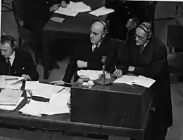 The Labour Party won a landslide victory in the United Kingdom general election of 1945 and Sir Hartley Shawcross became Attorney General and took responsibility as Britain's chief prosecutor in the Nuremberg Trials. Shawcross, to emphasise the non-partisan nature of the trials, appointed Maxwell Fyfe his deputy. Shawcross was largely committed to his political duties in Westminster and played little part other than delivering the opening and closing speeches. Maxwell Fyfe took on most of the day-to-day responsibilities as "capable lawyer, efficient administrator and concerned housemaster".[8] There were misgivings in some quarters as to how Fyfe would perform, cross-examination not being regarded as one of his strengths. However, his cross-examination of Hermann Göring was one of the most noted cross-examinations in history.[3]