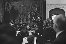 Zinman became music director of the Tonhalle-Orchester Zürich in 1995. His innovative programming with that orchestra included a series of late-night concerts, "Tonhalle Late", which combined classical music and a nightclub setting.[6] His recordings of the complete Beethoven symphonies for Arte Nova were based on the Jonathan Del Mar critical edition and was acclaimed by critics. He subsequently recorded Beethoven's overtures and concertos with the Tonhalle.[7][8][9] He conducted the Tonhalle Orchestra in its first-ever appearance at The Proms in 2003.[10] He concluded his Tonhalle music directorship on July 21, 2014, with a concert at The Proms.[11]