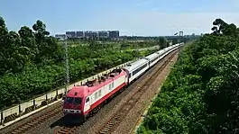 From June 2005 to 1 July 2009, the entire line was electrified.[3] A second track was opened on the Chengdu–Suining section on 1 April 2006 that allows trains to reach a top speed of 200 km/h.[3] A second line was added to the Suining-Sanhui section in the east and trains can reach 160 km/h on this section.[3]