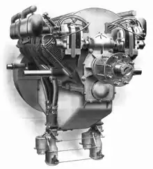 The propeller shaft was geared down from the crankshaft by spur gears and rotated at half the engine speed. The intake and exhaust valves were controlled by a single camshaft, which was placed between the two rows of cylinders. The camshaft was connected to the propeller shaft and therefore also rotated at half speed of the crankshaft.