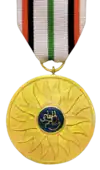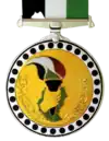 The flag medal consists of a bronze medal plated with gold or silver, 40 millimetres in diameter and five millimetres thick. It is worn on the left side of the chest and consists of three tandem surfaces. The first is a circle with a diameter of 12 millimetres from the white enamel on which the word 'flag' is written in gold in the case of the gold medal. And in the silver colour, in the case of the silver medal, the second is a planet with five long branches and five other short branches, and the third is a circle whose circumference ends with the ends of the short branches. The red, white, and black have a combined width of 10 millimetres.[5] On 7 November 1998, a similar award, Az-Zubair Prize for Innovation and Scientific Excellence was established by President Omar al-Bashir to commemorate General Az-Zubair Mohammed Salih, former Sudan's vice president who died in an aeroplane crash.[25] |