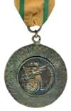It consists of a copper nacre plated with shiny silver, its diameter is 36 mm and its thickness is 2.8 mm. It is worn on the chest from the left side. The front side of the medallion consists of a flying camel inside a disc placed between the flags of the dual government on both sides, and the sun shining on the distant horizon in the form of a semi-circle from the top of the medallion. On the reverse side of the medallion is written the phrase "The Evacuation of Foreign Forces." The medallion hangs from a white ribbon of shiny silk, in the middle of which is the flag of the Sudan Defense Force, with two borders of red color on the edges.[5] |