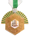 It consists of a silver medal plated with gold water in the case of the silver medal and bronze in the case of the bronze medal. It includes three synonymous surfaces. The first is a circle with a diameter of 30 mm. At the bottom, there is a gear symbolizing industry. On one side of the circle is a branch of the cotton tree, and on the other side is a design symbolizing energy. And technological sciences, in the middle of which is a curved shape that symbolizes openness to agricultural production with its multiplicity of varieties, and bears the word 'production' in a circular shape. The second surface is a star with seven branches sloping on the surface and the sides, and the third is a star of six branches with a flat top and sloping ends, and it is worn on the chest from the left side 22 millimetres. The green colour is mediated by one white line in the case of the Golden Medal, two white lines in the case of the Silver Medal, and three white lines in the case of the Bronze Medal.[5] |